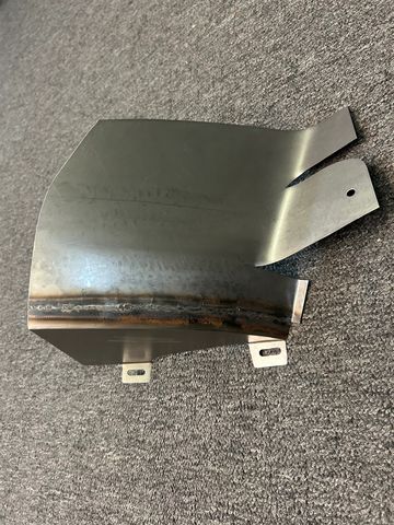 Replacement wiper motor splash shield. Made of steel. Modified to fit the larger wheels and tires.